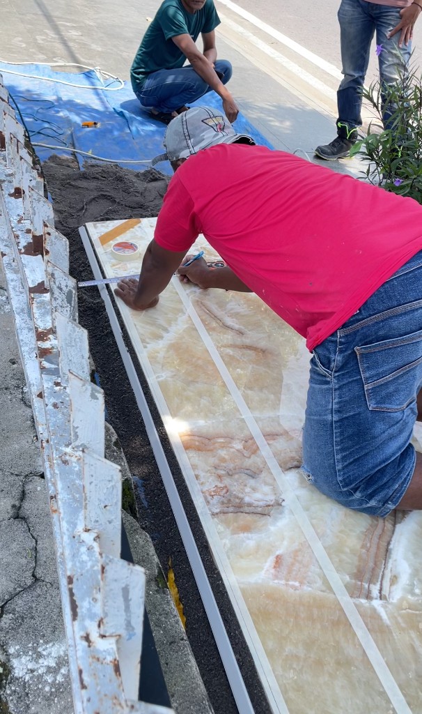 - Efek cahaya yang tidak tertandingi. Onik adalah batu alam yang bisa meneruskan cahaya. Dengan backlight di bawah countertop, corak alaminya menyala indah — tidak bisa direplikasi oleh marmer biasa.